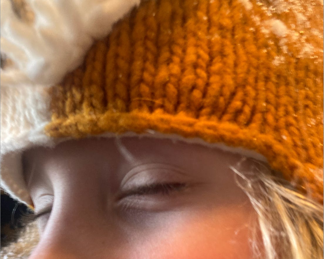 Kids in snow for hours. They show me a tunnel they have made, storage, shelving. Hilton’s cheeks dark pink. Flo’s light pink.